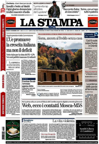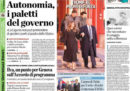 Ci sono molte notizie diverse in apertura sui quotidiani di oggi: alcuni si occupano dell’aggressione subita a Ostia da un giornalista di Rai Due mentre cercava di intervistare un membro della famiglia Spada sul suo appoggio a CasaPound, altri seguono le vicende politiche della sinistra dopo le elezioni in Sicilia. Il Corriere della Sera titola sull’arresto per evasione fiscale del neo eletto deputato regionale siciliano De Luca, la Stampa anticipa le previsioni della Commissione europea sul PIL dell’Italia che dovrebbero essere comunicate oggi, e il Messaggero intervista il presidente dell’Autorità di garanzia per gli scioperi Passarelli.