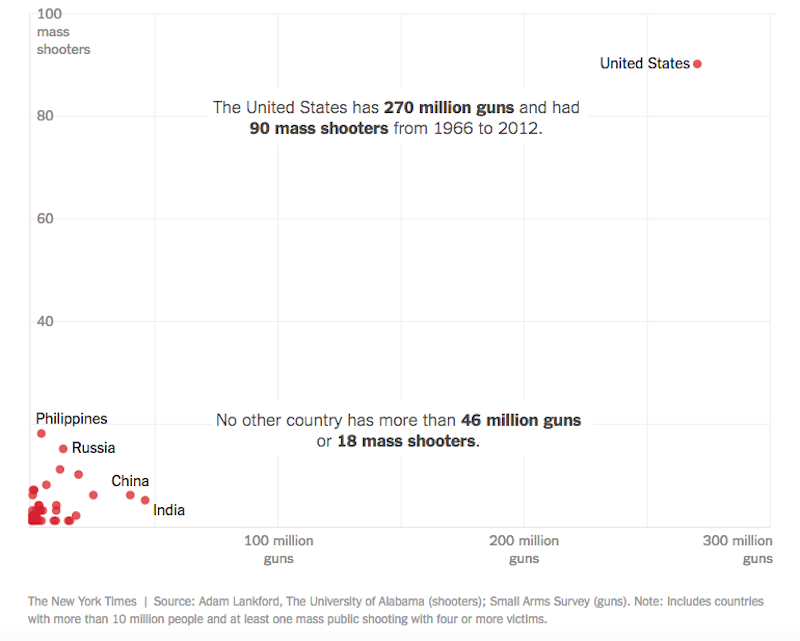Negli Stati Uniti ci sono circa 270 milioni di armi, il 42 per cento di quelle che attualmente esistono nel mondo (nonostante gli americani rappresentino il 4,4 per cento della popolazione mondiale). Nessun altro paese ne ha più di 46 milioni. Fra il 1966 e il 2012, gli Stati Uniti hanno avuto 90 sparatorie di massa con più di quattro persone uccise. Le Filippine, il paese secondo in questa classifica, ne ha avute 18. I dati sono tratti da uno studio del 2015 del criminologo Adam Lankford, e sono stati messi su un grafico dal New York Times.