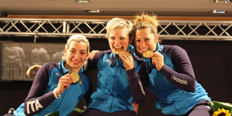 Bebe Vio, Loredana Trigilia e Andreea Mogos hanno vinto l’oro nel fioretto a squadre ai Mondiali Paralimpici in corso a Fiumicino. In finale hanno battuto la Russia, dopo aver sconfitto Hong Kong. Vio – la più famosa atleta paralimpica italiana – aveva già vinto l’oro nel fioretto individuale. Agli ultimi Giochi Paralimpici in Brasile Vio aveva vinto due medaglie, l’oro nel fioretto individuale e il bronzo in quello a squadre.