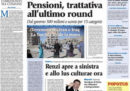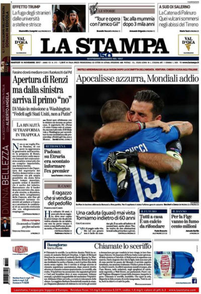 Tutte le prime pagine di oggi dividono l’apertura fra l’eliminazione dell’Italia dai Mondiali in Russia dopo il pareggio di ieri sera per 0-0 contro la Svezia e le altre notizie della giornata, che sono le ipotesi di un accordo in vista delle prossime elezioni fra i partiti di sinistra, con l’apertura di Renzi nella direzione del Partito Democratico respinta da MDP, e la trattativa fra governo e sindacati sull’innalzamento dell’età pensionabile. Il Fatto torna a occuparsi dell’inchiesta CONSIP, mentre Libero critica la richiesta del presidente del Parlamento europeo Tajani di aumentare i fondi destinati dagli stati al bilancio europeo.