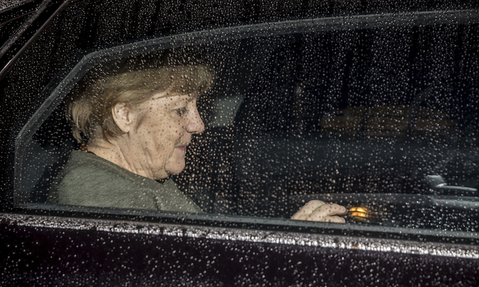 Angela Merkel lascia il Parlamento dopo i colloqui per la formazione del governo, Berlino, 17 novembre 2017 (Michael Kappeler/dpa via AP)