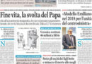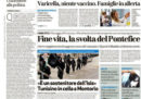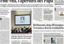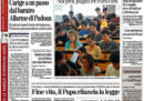 La maggior parte dei giornali di oggi titola sulle parole sul fine vita di Papa Francesco, che ha detto che è moralmente lecita la rinuncia all’accanimento terapeutico. La Stampa, il Sole 24 Ore e il Secolo XIX aprono invece sulle difficoltà della banca Carige, per la quale si ipotizza l’intervento della Banca Centrale Europea, il Giornale critica le ipotesi di accordo fra Partito Democratico e partiti di sinistra per l’approvazione al Senato della legge sullo ius soli, il Fatto e il Dubbio seguono lo stato di salute di Totò Riina, ricoverato in fin di vita nel carcere di Parma, e Libero e il Mattino si occupano della sentenza che ha cancellato l’assegno di mantenimento di Silvio Berlusconi a Veronica Lario.