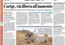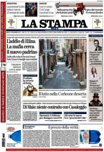 La notizia di apertura su tutte le prime pagine di oggi è la morte del boss mafioso Totò Riina, avvenuta ieri notte nel carcere di Parma; mentre alcuni giornali commentano con soddisfazione la sua morte, su molte prime pagine si riporta la reazione della Chiesa contraria alla celebrazione del suo funerale. Il Sole 24 Ore, Libero e il Secolo XIX si occupano invece di banche, con la decisione dei soci di Carige di avviare l’operazione di salvataggio, mentre i quotidiani sportivi presentano la giornata di campionato che si gioca oggi e domani dopo la sosta per la Nazionale.