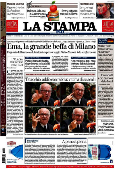 La scelta della nuova sede dell'Agenzia Europea per i Medicinali, il fallimento dei colloqui per il nuovo governo in Germania, e le dimissioni di Tavecchio