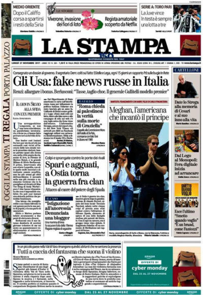 La maggior parte dei giornali di oggi apre sugli interventi di ieri dei due leader del centrodestra e del centrosinistra Berlusconi e Renzi, già nel pieno della campagna elettorale: il primo ha parlato alla convention di Forza Italia ed è stato intervistato da Fabio Fazio a Che tempo che fa, ipotizzando come possibile premier il generale dei carabinieri Gallitelli e promettendo la riduzione delle tasse; il secondo ha chiuso la riunione della Leopolda, annunciando di voler estendere il bonus di 80 euro anche alle famiglie con figli. La Stampa e Repubblica si preoccupano invece delle fake news in vista delle elezioni, il Messaggero titola sulla situazione a Ostia, e il Sole 24 Ore presenta la sua classifica sulla qualità della vita nelle città italiane, mentre i giornali sportivi commentano i risultati del campionato di calcio con le vittorie di Napoli e Juventus in testa alla classifica.