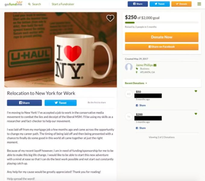 Con l’aiuto di altri giornalisti, Reinhard aveva iniziato a indagare su Phillips e il suo passato, per trovare elementi che potessero confermare o smentire la storia. Ed è così che ha trovato una pagina online di una campagna di finanziamento a nome Jaime Phillips dello scorso maggio, con questo messaggio: