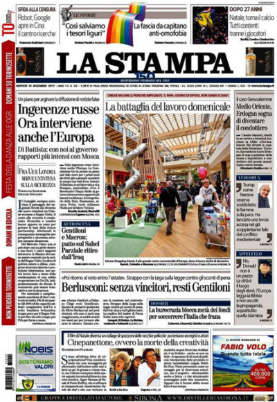 Ci sono notizie diverse in apertura sui giornali di oggi: molti si occupano delle tensioni nel centrodestra dopo le parole del leader di Forza Italia Silvio Berlusconi, che ha ipotizzato che il governo Gentiloni possa restare in carica anche dopo le elezioni se non ci fosse una maggioranza per formare un nuovo governo. La Stampa si preoccupa delle ingerenze russe sulle prossime elezioni, il Manifesto titola sullo sciopero dei piloti Ryanair e sulle sanzioni minacciate dall’azienda per chi sciopera, Avvenire apre sulla gestione dei migranti in Libia, e il Giornale ipotizza rapporti stretti fra Movimento 5 Stelle e contestatori del gasdotto in Puglia.