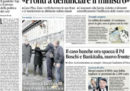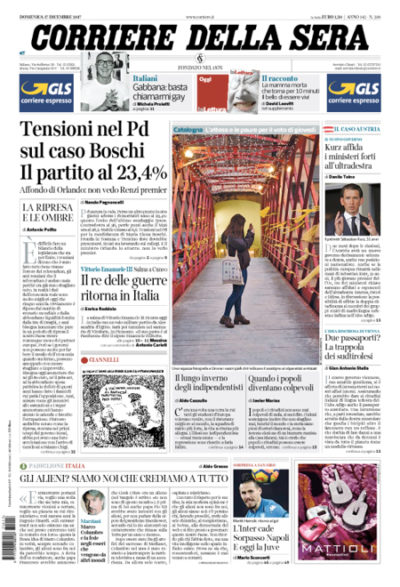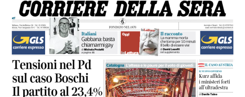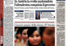 Su praticamente tutte le principali prime pagine di oggi si parla del nuovo governo austriaco, che è nato dall’accordo tra il Partito Popolare e un partito di estrema destra, e che quindi sarà molto di destra. Il Corriere della Sera apre invece sui sondaggi in Italia, in particolare dopo gli ultimi sviluppi del caso Boschi. I quotidiani sportivi invece parlano delle partite di ieri di Serie A: una brutta sconfitta per l’Inter, una vittoria netta per il Napoli e una rocambolesca per la Roma.