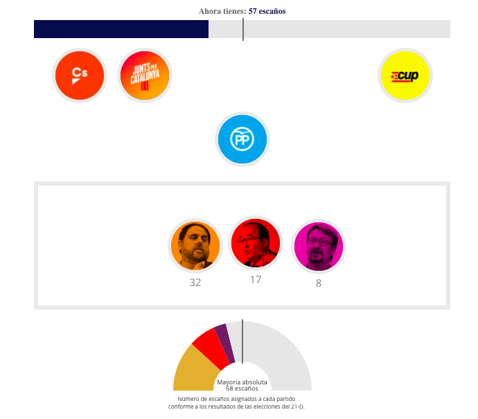 I risultati elettorali in Catalogna in una grafica pubblicata dal quotidiano spagnolo Diario: l’unica maggioranza parlamentare possibile sembra essere quella formata da JxCat, ERC e la CUP (70 deputati), mentre il partito più votato e che ha ottenuto più seggi è stato C’s (Ciutadans). Il PSC (Partito socialista catalano) ha ottenuto 17 seggi, il PP (Partito popolare catalano) 3 seggi, En Comú-Podem (coalizione di forze vicine a Podemos) 8 seggi