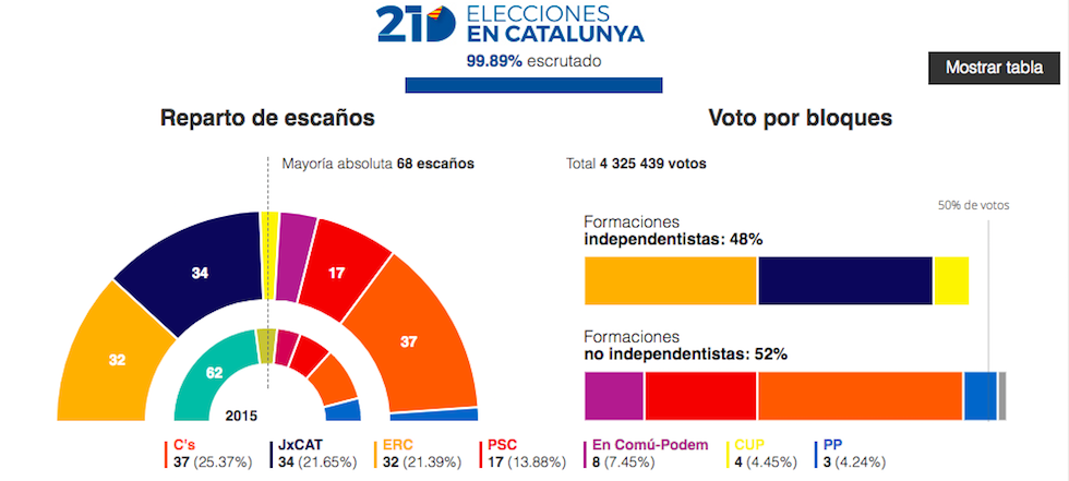 Se si guardano i dati elettorali dei due blocchi – indipendentista e anti-indipendentista – i risultati di ieri sono molto simili a quelli ottenuti alle elezioni del 2015, da cui era uscito il governo di Carles Puigdemont: l’indipendentismo ha vinto, ma non abbastanza; l’anti-indipendentismo ha perso, ma non del tutto.