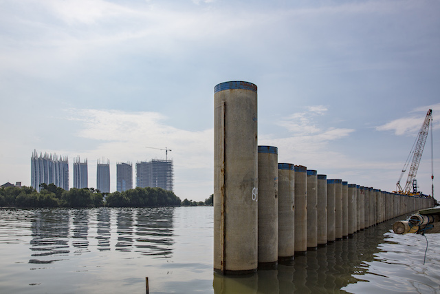 Nel frattempo davanti ad alcune aree della baia si è più semplicemente deciso di costruire una grande barriera con lo scopo di fermare l’acqua. Kimmelman ha scritto che è «quasi-temporanea» e che se l’abbassamento di Giacarta (e il contemporaneo innalzamento delle acque) dovesse continuare con questo passo, «la barriera sarà sott’acqua entro il 2030». E la barriera non copre comunque tutta la costa: Kimmelman ha scritto che ci sono almeno una ventina di posti in cui per fermare l’acqua ci sono solo dei «bassi e fatiscenti blocchi di cemento».