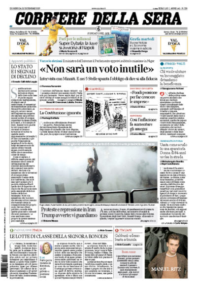 La principale notizia di politica italiana dei giornali di oggi riguarda il Movimento 5 Stelle, che ieri ha pubblicato le sue nuove regole: ci sono un nuovo Statuto, un nuovo organigramma, un nuovo Codice Etico e le regole per le parlmentarie. La principale notizia di esteri riguarda invece le proteste in Iran, le più grandi dal 2009, in cui sono morti almeno sei manifestanti. Ieri si è anche giocata l’ultima giornata di Serie A del 2017: hanno vinto Juventus e Napoli; hanno pareggiato Inter, Roma, Milan e Lazio.