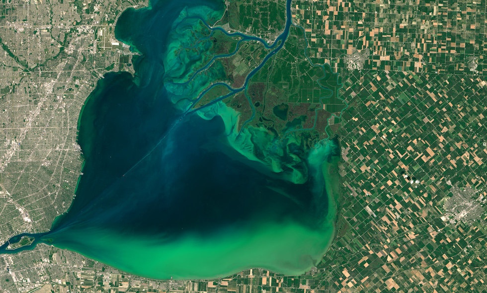 Lo scorso agosto la fioritura di una specie di alghe tossiche nel Lago Erie – uno dei Grandi Laghi dell’America Settentrionale intorno a cui sorgono città come Cleveland, Detroit e Buffalo – ha costretto migliaia di persone tra Stati Uniti e Canada a cercare nuove fonti di acqua potabile. La fioritura di quest’anno è stata una delle più grandi di sempre e i banchi di alghe si estendevano dalla città di Toledo fino all’Ontario, dando all’acqua del lago un particolare colore smeraldo. Questa foto satellitare è stata diffusa dalla NASA.