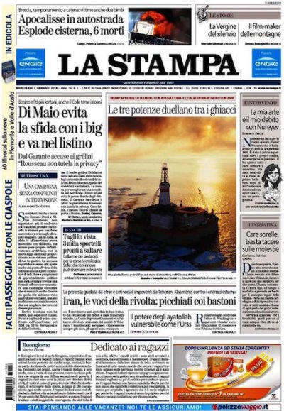 Ci sono notizie diverse in apertura sui giornali di oggi: alcuni si occupano della campagna elettorale in vista delle prossime elezioni, con il mancato accordo fra il Partito Democratico e la lista +Europa di Emma Bonino e l’intenzione del leader del Movimento 5 Stelle Di Maio di non candidarsi in un collegio uninominale annunciata dalla Stampa. Il Corriere della Sera apre invece sull’incidente in autostrada vicino a Brescia che ha provocato 6 morti, il Manifesto segue le proteste contro il governo in Iran, il Giornale titola sulle osservazioni del Garante della privacy al Movimento 5 Stelle per la gestione della piattaforma Rousseau, e Libero è preoccupato per la possibilità di mangiare gli insetti in Europa. I quotidiani sportivi si occupano della Coppa Italia, con la vittoria di ieri dell’Atalanta sul Napoli e la presentazione della partita di stasera fra Juventus e Torino, e dell’apertura del mercato dei calciatori di gennaio.