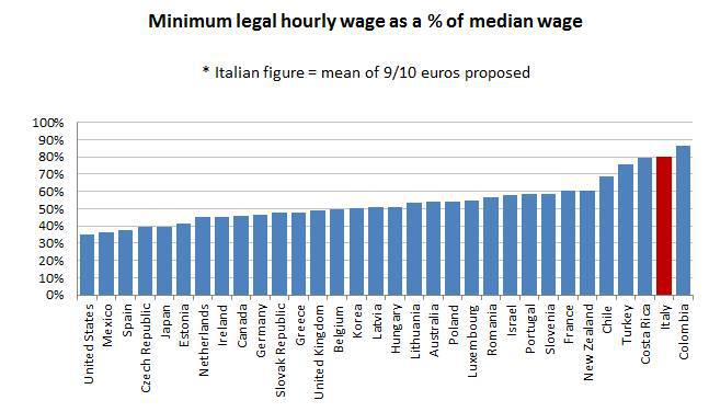 La proposta del PD introdurrebbe in Italia uno dei salari minimi proporzionalmente più alti al mondo. Come ha notato il ricercatore dell’OCSE Thomas Manfredi, normalmente il salario minimo viene fissato intorno alla metà della retribuzione mediana di un determinato paese: è così ad esempio nel Regno Unito, in Belgio e in Francia. Se il salario minimo italiano venisse fissato intorno ai 9-10 euro orari sarebbe pari a circa l’80 per cento della retribuzione mediana italiana, un livello raggiunto soltanto da Costa Rica e Colombia.