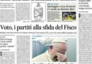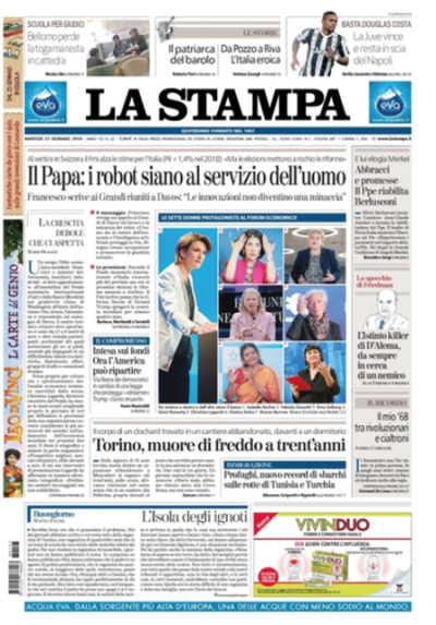 Ci sono notizie diverse in apertura sui quotidiani di oggi: alcuni si occupano del forum economico di Davos e delle stime del Fondo Monetario Internazionale sul PIL dell’Italia, rivisto al rialzo, altri dell’intervento del presidente della Conferenza Episcopale Italiana indirizzato ai partiti in vista delle prossime elezioni. Il Giornale e Libero titolano invece sul rinvio a giudizio per riciclaggio chiesto dal pubblico ministero per Gianfranco Fini per la vicenda della casa di Montecarlo, il Messaggero esamina le proposte elettorali dei vari partiti sul fisco, e i quotidiani sportivi aprono sulla vittoria della Juventus nel posticipo di campionato di ieri sera.