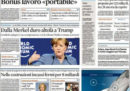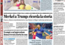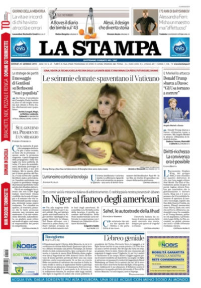 Ci sono notizie diverse in apertura sui quotidiani di oggi: alcuni titolano sull’annuncio della clonazione riuscita in Cina di due scimmie con il metodo già usato con la pecora Dolly venti anni fa, altri aprono con l’intervento del cancelliere tedesco Merkel al vertice economico di Davos, critico con la decisione del presidente degli Stati Uniti Trump sui dazi commerciali, altri ancora seguono la campagna elettorale, con le trattative nei partiti sui nomi dei candidati. Il Manifesto critica il governo tedesco per la vendita di armi alla Turchia e a altri paesi in guerra, mentre Libero è preoccupato per la gestione della sanità pubblica nei weekend, e i giornali sportivi titolano sui due recuperi di campionato giocati ieri, con la vittoria della Lazio con l’Udinese e il pareggio fra Sampdoria e Roma.