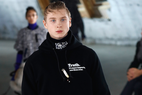 Un modello con una felpa di Sacai con il motto della campagna del New York Times “Truth”, Parigi, 20 gennaio 2018 (FRANCOIS GUILLOT/AFP/Getty Images)