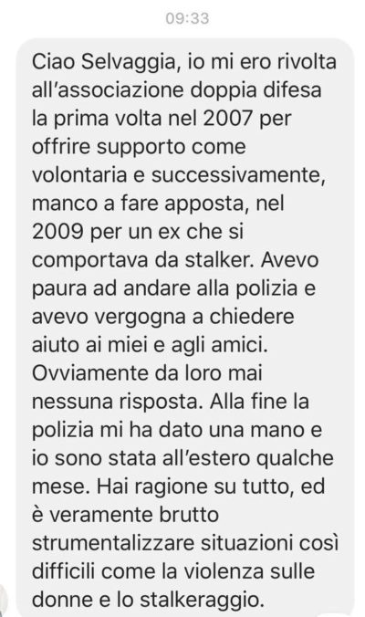 «Ho chiamato un’avvocato che lavora per l’associazione, le ho chiesto se avesse fornito assistenza legale a qualche donna passata attraverso Doppia Difesa nell’ultimo anno, mi ha risposto ‘Non posso parlare dell’attività dell’associazione senza consultare la Bongiorno. Comunque tra qualche ora le invierò dei dati’. Mai pervenuti. Eppure era una domanda semplice. Se raccogli dei fondi e fai spot in tv, un po’ di trasparenza non guasterebbe».