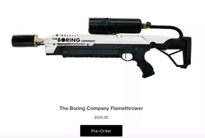 Alla fine dello scorso anno Musk aveva messo in vendita sul sito di Boring Company – la sua azienda che progetta sistemi di trasporto sotterranei per evitare il traffico nelle grandi città – un cappellino con il logo della società, dicendo che se ne avesse venduti 50mila in breve tempo avrebbe messo in vendita come secondo gadget aziendale un lanciafiamme.