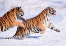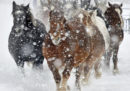Neve e animali sono due tra i soggetti più fotografati, e quando c’è l’occasione che siano entrambi i protagonisti di una fotografia ne escono raccolte come questa, fatta con le foto diffuse negli ultimi mesi da alcune grandi agenzie fotografiche. Ci sono manti imbiancati e fiocchi sfocati che fanno da sfondo a momenti suggestivi come la corsa di cavalli; a volte i colori si confondono o richiamano, come il bianco della neve e quello dei cigni o delle pecore in un prato. E poi ci sono foto quasi pacifiche (una volpe accucciata in mezzo al bianco), altre buffe (un panda che si rotola nella neve) o semplicemente molto belle, da guardare.