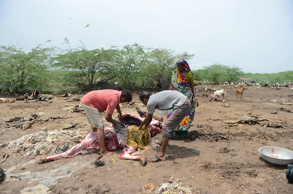 Alcuni lavoratori rimuovono la pelle dalla carcassa di una mucca morta alla periferia di Wadhvan, nello stato del Gujarat, agosto 2016. (SAM PANTHAKY/AFP/Getty Images)