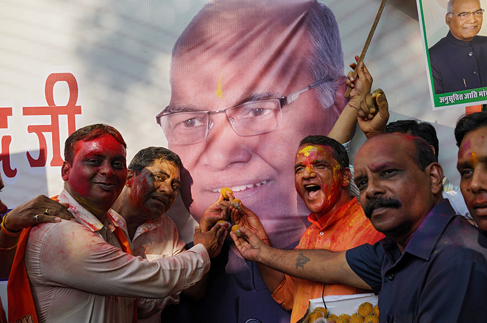 Festeggiamenti per la vittoria del secondo presidente dalit nella storia dell’India, Ram Nath Kovind, Nuova Delhi, luglio 2017. (CHANDAN KHANNA/AFP/Getty Images)
