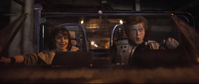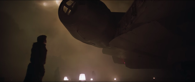 In sottofondo, si sente Han raccontare: «Vivo di truffe in strada da quando avevo dieci anni. Cacciato dall’accademia di volo perché ragiono con la mia testa. Diventerò un pilota. Il migliore della galassia». Intanto viene mostrato per la prima volta il Millennium Falcon, la sua storica astronave. La distinguiamo dalla forma della cabina, quella cosa che spunta dal lato destro.