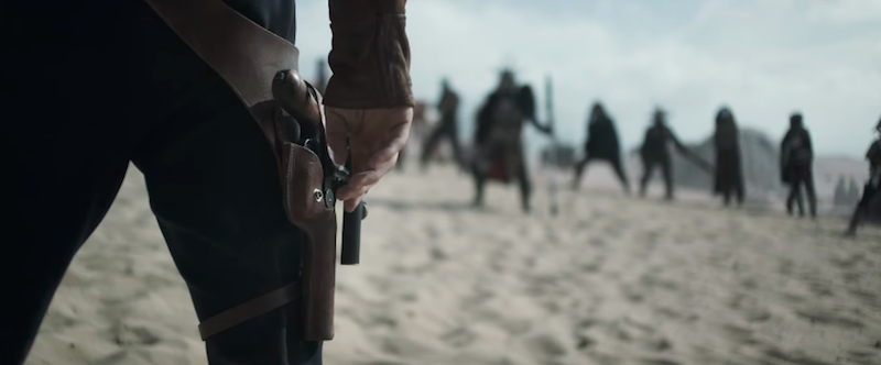 Una delle micro-scene più apprezzate del trailer mostra un momento di stallo prima di una sparatoria su una spiaggia, con un’inquadratura da western sulla pistola di Han. Potrebbe essere una citazione della controversia nata da una modifica del primissimo film nell’edizione del 1997. Nella scena del bar di Mos Eisley, Han Solo spara e uccide un cacciatore di taglie che stava per catturarlo. La scena però è stata leggermente modificata per far sembrare che sia il cacciatore di taglie a sparare per primo, legittimando Han – che nel frattempo era diventato uno dei personaggi più popolari del film nel fronte dei “buoni” – a reagire e uccidere. Il movimento di Han per sbloccare la fondina della sua pistola è lo stesso, nel film del 1977 e in quello che sta per uscire.