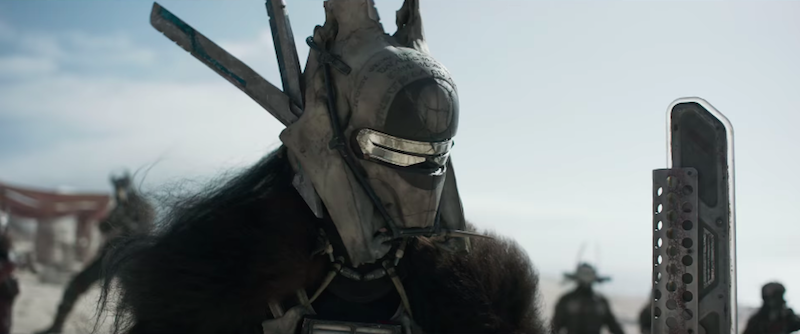 Intuiamo che il personaggio con la pelliccia e le lame che gli spuntano dal casco sia l’antagonista principale del film: si vede anche in un altro paio di spezzoni e nel breve teaser mandato in onda durante il Super Bowl. Di lui non sappiamo nulla: né il nome né l’attore o attrice che lo interpreta.