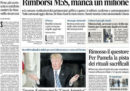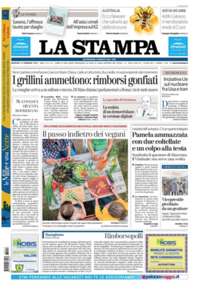 Quasi tutti i giornali di oggi seguono in apertura la vicenda dei versamenti che secondo le regole del Movimento 5 Stelle i parlamentari avrebbero dovuto effettuare al fondo per il microcredito alle imprese e che invece secondo le ricostruzioni presenterebbero un ammanco di oltre un milione di euro. Libero e il Manifesto si occupano ancora delle vicende di Macerata, con la sostituzione del questore decisa ieri dal ministero dell’Interno, Avvenire titola sulle aggressioni contro gli insegnanti nelle scuole, e i quotidiani sportivi presentano la partita di stasera fra Juventus e Tottenham per gli ottavi di Champions League.