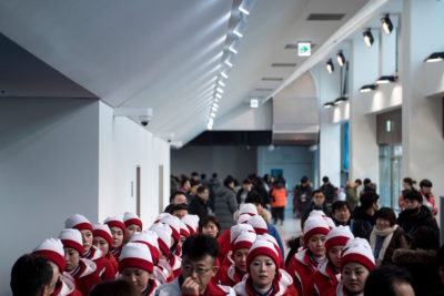 Lunedì scorso le cheerleader nordcoreane hanno assistito alla partita di hockey femminile tra Corea e Svezia, la seconda gara della nazionale coreana unificata – nord e sud – alle Olimpiadi invernali che si stanno tenendo in Corea del Sud. Le cheerleader sono entrate nel palazzetto del ghiaccio di Kwandong in fila ordinata, accompagnate dall’immancabile funzionario nordcoreano che probabilmente svolge anche il ruolo di controllore. Si sono sedute nel settore che era stato riservato loro sugli spalti, accolte con grande curiosità ma anche diffidenza dagli spettatori presenti. Erano vestite in maniera identica – tuta da neve rossa e scarpe bianche simili alle Adidas – e tenevano in mano bandiere blu e bianche della Corea unita.