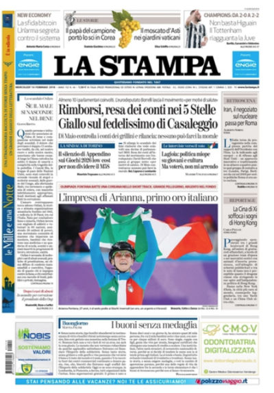 Il caso dei rimborsi del Movimento 5 Stelle, la medaglia d'oro di Arianna Fontana, e il pareggio della Juventus in Champions League