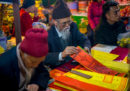 Un uomo tibetano con la faccia sporca di tsampa, un cibo tipico fatto di farina di orzo e burro di yak: come buon auspicio per l’anno nuovo, i tibetani lanciano per tre volte un pizzico di tsampa nell’aria e poi ne mangiano un po’. La foto è stata scattata a Kathmandu, in Nepal, 16 febbraio 2018