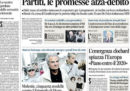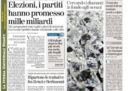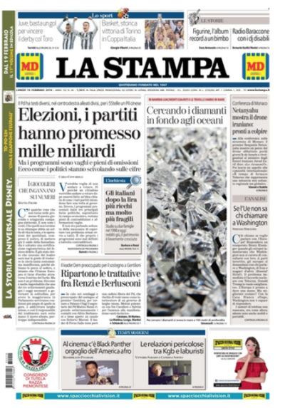 La campagna elettorale per le prossime elezioni politiche è in apertura su tutti i giornali di oggi: alcuni si occupano dell’ipotesi di formazione di un governo di larghe intese dopo il voto, altri analizzano i costi delle proposte economiche dei vari partiti, mentre il Corriere della Sera titola sulla vicenda che riguarda il figlio del governatore della Campania De Luca, il Giornale apre sulla proposta di Silvio Berlusconi di assunzioni e aumenti salariali per le forze dell’ordine, e il Fatto si occupa della presenza di candidati massoni nelle varie liste. I giornali sportivi commentano i risultati della domenica di serie A, con le vittorie di Napoli e Juventus che continuano il loro cammino in testa alla classifica.