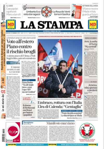 Accanto alle notizie sulla campagna elettorale, fra le quali il piano per evitare brogli nel voto degli italiani all’estero in apertura sulla Stampa e il Secolo XIX e l’incontro fra Casini e Renzi in una casa del popolo bolognese sul Manifesto, i giornali dedicano molto spazio sulle prime pagine al fallimento della trattativa fra il ministro dello Sviluppo economico Calenda e l’azienda Embraco per evitare i licenziamenti di 500 persone nel suo stabilimento in Piemonte, con il giudizio molto critico del ministro sulla gestione della vicenda da parte di Embraco. Avvenire, il Gazzettino e Leggo titolano invece su una ricerca per la quale sono ancora notevoli le differenze fra Italia del nord e del sud per l’aspettativa di vita.