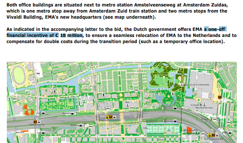 Nei giorni scorsi, inoltre, il governo olandese aveva diffuso l’appendice “segreta” del progetto sottoposto al Consiglio, su cui i giornali italiani avevano fatto molte ipotesi nelle scorse settimane. Nell’appendice non c’è nulla di davvero rilevante: i suoi autori dicono di averlo tenuto segreto per non permettere ai proprietari degli edifici temporanei di aumentare repentinamente il canone di affitto. Nel documento c’è anche quello che il governo olandese chiama “incentivo finanziario” da 18 milioni di euro, una specie di offerta a EMA per incoraggiare la scelta di Amsterdam. A quanto risulta al Post, gli incentivi di questo tipo non infrangono le regole europee sui bandi di gara.