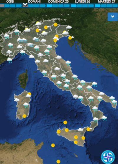 Domani, sabato 24 febbraio, il tempo non sarà molto migliore di oggi. Anzi, in certi posti sarà pure peggiore. Al nord ci saranno nuvole praticamente ovunque, con piogge abbondanti e possibili nevicate soprattutto su Piemonte, Valle d’Aosta, Liguria e Emilia-Romagna. Le uniche regioni in cui potrebbe non piovere saranno quelle del nord-est. Al centro e in Sardegna sono previste nuvole, piogge e temporali (in particolare sulle Marche). Potrebbe nevicare, ma solo sopra i 1.500 metri. E anche al sud stessa storia: precipitazioni, che in qualche caso potrebbero essere “a carattere temporalesco”. Una delle poche regioni italiane parlando della quale si possano usare per domani, con cognizione di causa, le parole “cielo sereno” è la Sicilia.