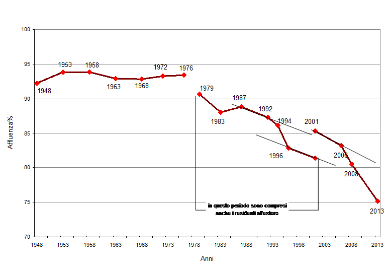La tendenza storica ci dice che in Italia votano sempre meno persone: nell’immediato Dopoguerra l’affluenza alle elezioni politiche superava il 90 per cento, negli anni Ottanta stava fra 90 e 80 e nel 2013 è scesa per la prima volta sotto l’80 per cento, arrivando al 75,2 per cento.
