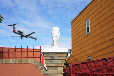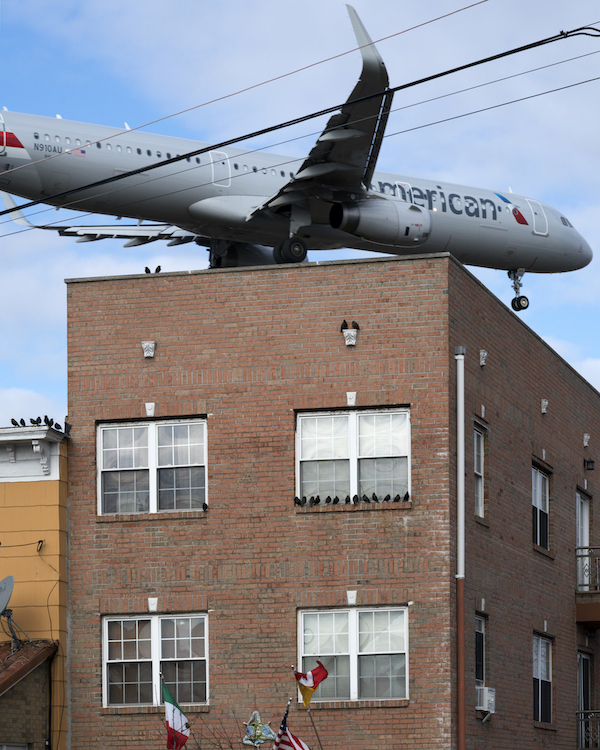 Negli ultimi mesi David Rothenberg ha fotografato gli aerei di linea che atterrano sulla pista 4 dell’aeroporto di LaGuardia, a New York, e che per farlo passano sopra a East Elmhurst e dintorni, nel Queens. Nelle sue foto gli aerei sembrano estremamente vicini alle case, perché effettivamente lo sono: Rothenberg ha spiegato che capita che scendano fino a circa 45 metri da terra a intervalli regolari, anche ogni 90 secondi: «Vedere un Boeing 757 volare a bassa quota vicino alle case, ai fili telefonici, è uno spettacolo disorientante. Le mie fotografie esplorano questa straordinaria intrusione all’interno di un paesaggio ordinario».