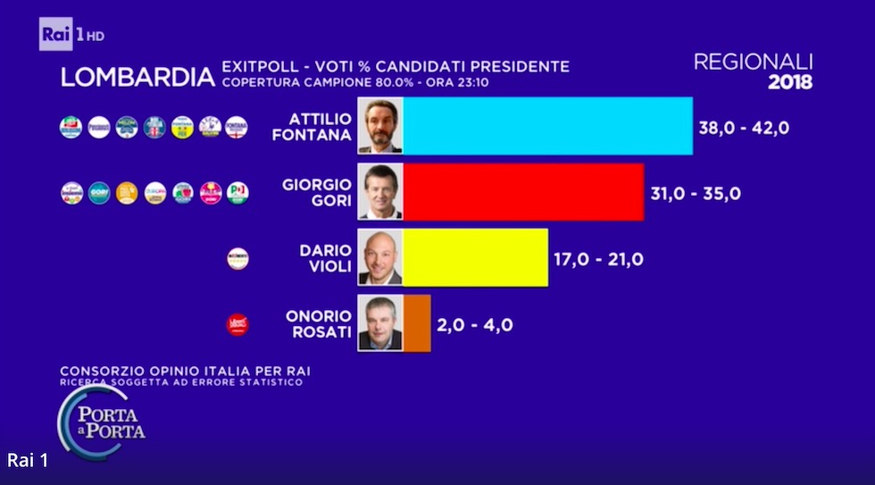 Per quanto riguarda la Lombardia, secondo gli exit poll del consorzio Opinio Italia per la Rai, Attilio Fontana, ex sindaco di Varese della Lega appoggiato dal centrodestra, è in testa, come previsto dai sondaggi: avrebbe ottenuto tra il 38 e il 42 per cento dei voti. Giorgio Gori, sindaco di Bergamo appoggiato dal Partito Democratico e da parte del centrosinistra, starebbe tra il 31 e il 35 per cento.