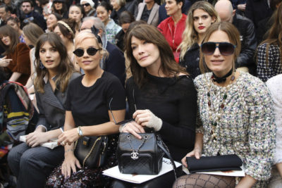 Gli abiti erano più bon-ton del solito pur presentando le classiche linee di Chanel, fatte di tailleur in tweed con giacca e gonna fino al ginocchio accompagnate da perle, mentre i colori autunnali si mimetizzavano alle foglie e agli alberi intorno. C’erano anche orecchini portati spaiati – un cerchio e un pendente – collane e cinture con le iniziali o la scritta Chanel, eco-pellicce – una moda aperta da Gucci e Givenchy – e alti stivali dorati che molto probabilmente vedrete proposti e copiati nelle vetrine di molti negozi. Tra le tante modelle ha sfilato anche Kaia Gerber, la figlia 16enne di Cindy Crawford, mentre in prima fila c’erano l’attrice Lily Allen, Vanessa Paradis e Carla Bruni.