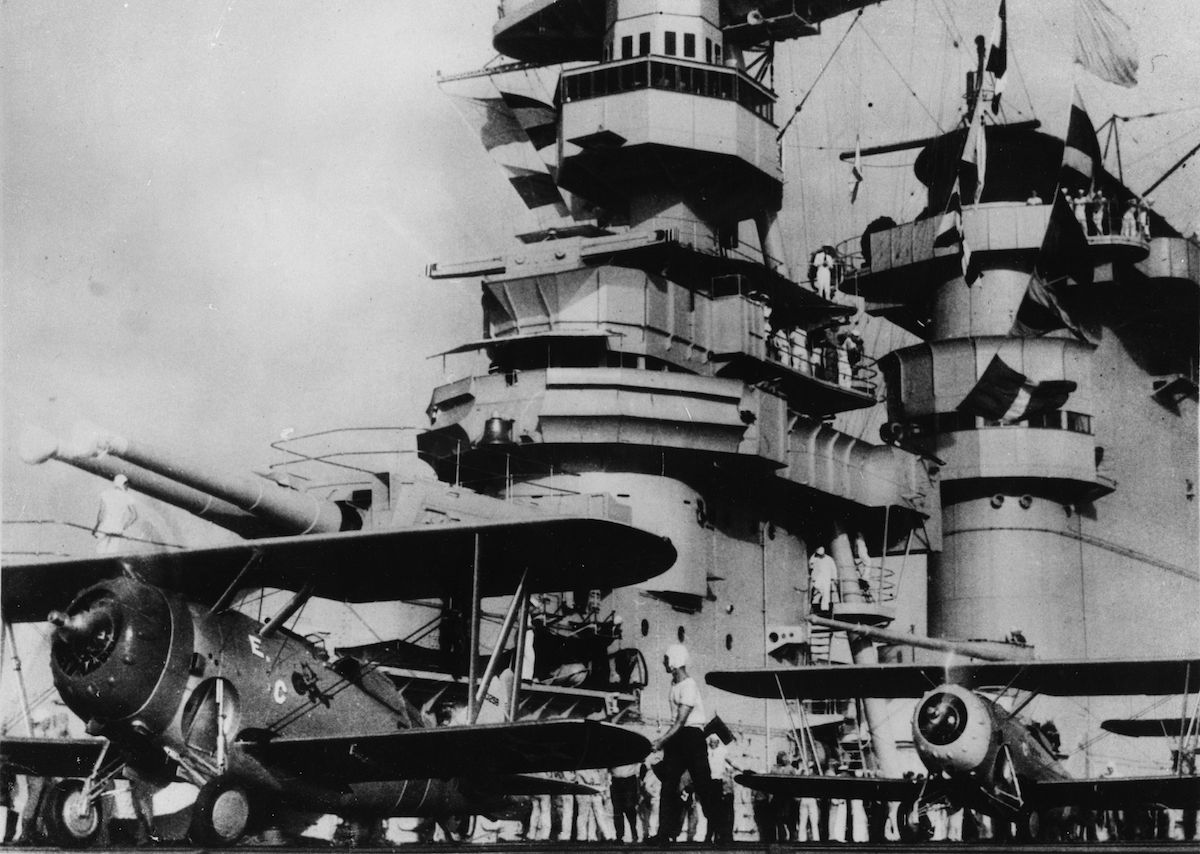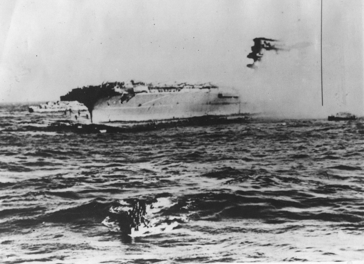 La USS Lexington in fiamme, prima di essere affondata, il 25 giugno 1942 (Keystone/Getty Images)