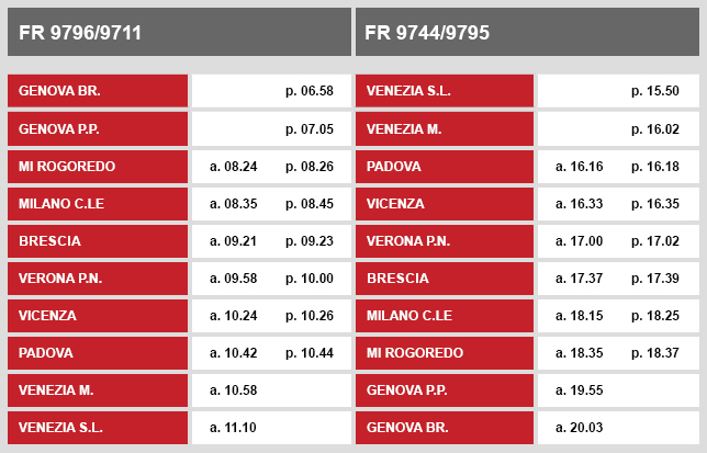 Gli orari del Frecciarossa che collega Genova e Venezia e di quello che fa il viaggio in direzione contraria: