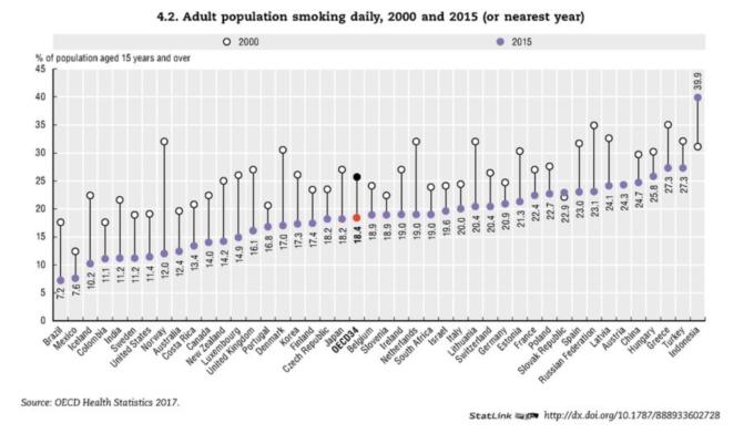 L’Austria ha uno dei più alti tassi di fumatori e fumatrici adulte dell’Unione Europea, ed è uno dei soli due stati membri dell’UE in cui il numero di adulti che fumano regolarmente non è diminuito tra il 2000 e il 2015 (i dati sono dell’Organizzazione per la cooperazione e lo sviluppo economico, OCSE).