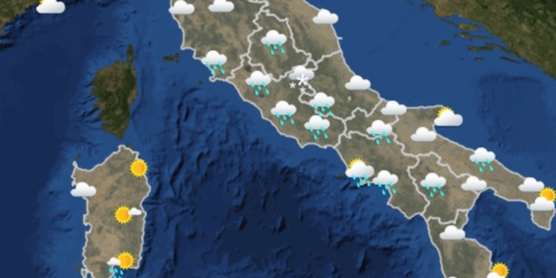 Per tutto il giorno ci sarà cielo nuvoloso e piogge, in molti casi temporalesche, su tutto il Centro Italia e la Sardegna. Dal pomeriggio nevicherà sugli Appennini abruzzesi, dai 1.000 metri di altitudine in su. Anche sui rilievi sardi nevicherà un po’: dai 900 metri in su.