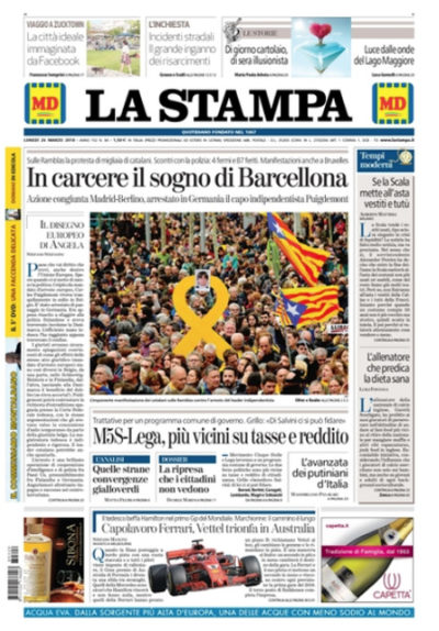 Tutti i giornali di oggi si occupano in apertura delle trattative fra centrodestra e Movimento 5 Stelle per la formazione di un nuovo governo, con interviste a Silvio Berlusconi sul Corriere della Sera e a Matteo Salvini sul Messaggero. Fa eccezione la Stampa, che titola sull’arresto in Germania dell’ex presidente catalano Puigdemont e sulle manifestazioni di protesta conseguenti a Barcellona, mentre i quotidiani sportivi aprono sulla vittoria della Ferrari di Vettel nel primo Gran Premio di Formula 1 dell’anno in Australia.