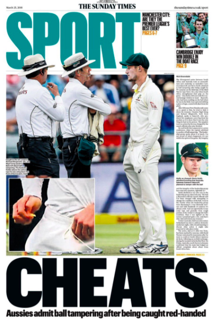 Sabato, nel corso del terzo giorno di gioco della partita tra Sudafrica e Australia, Cameron Bancroft, il giocatore più giovane della squadra australiana, ha tentato di manomettere di nascosto la palla sfregandola con un materiale di colore giallo che ha tenuto nascosto in tasca e poi dentro le mutande. I giudici di gara, notando come maneggiasse continuamente la palla, hanno interrotto il gioco per chiedergli cosa stesse facendo. Bancroft ha risposto dicendo di averla solamente pulita, mostrando un panno nero diverso da quello che nascondeva. Ma le telecamere del Newlands Stadium hanno ripreso tutto e a partita conclusa i giocatori australiani non hanno potuto fare altro che ammettere la scorrettezza.