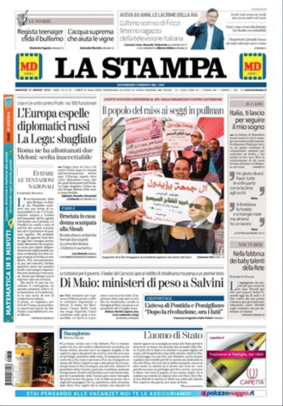 Mentre alcuni giornali in apertura seguono anche oggi le trattative per la formazione del nuovo governo, con le prime aperture da parte di Lega e Movimento 5 Stelle rispetto alla collaborazione reciproca, la maggior parte dei quotidiani titola sull’espulsione da parte di Stati Uniti e diversi paesi europei di oltre 100 diplomatici russi in risposta all’avvelenamento in Inghilterra dell’ex spia russa Skripal e della figlia. Libero apre invece sui dati economici del Regno Unito dopo il voto su Brexit, mentre il Fatto torna a occuparsi di uno dei suoi temi preferiti, il caso CONSIP.