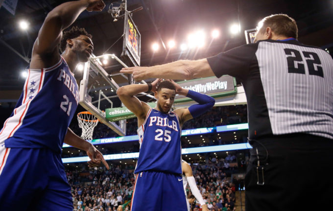 Ben Simmons e Joel Embiid protestano con un arbitro durante una partita contro Boston. (AP Photo/Michael Dwyer)
